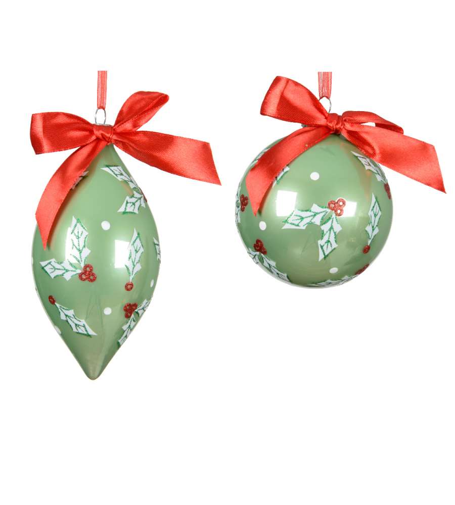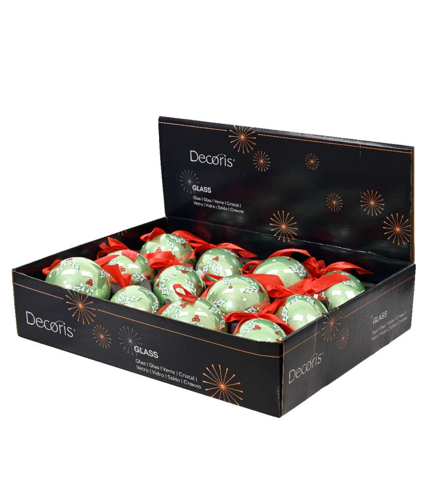 Palline di Natale in vetro Decoris, diametro 8 cm, colori assortiti, decorazioni eleganti con bacche e fiocco rosso, perfette per un tocco sofisticato al tuo albero.