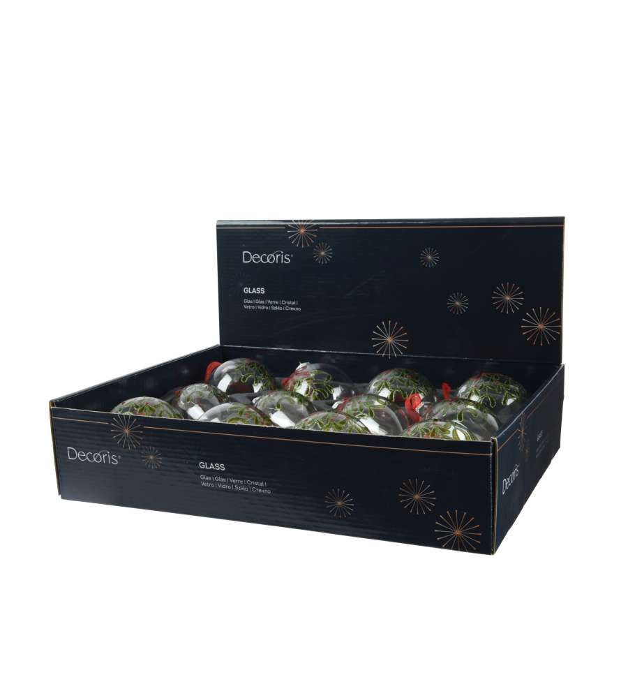 Pallina di vetro trasparente 8cm con accenti argento, decorata con foglie e glitter rossi, nastro di organza incluso. Elegante e scintillante, perfetta per decorazioni natalizie.