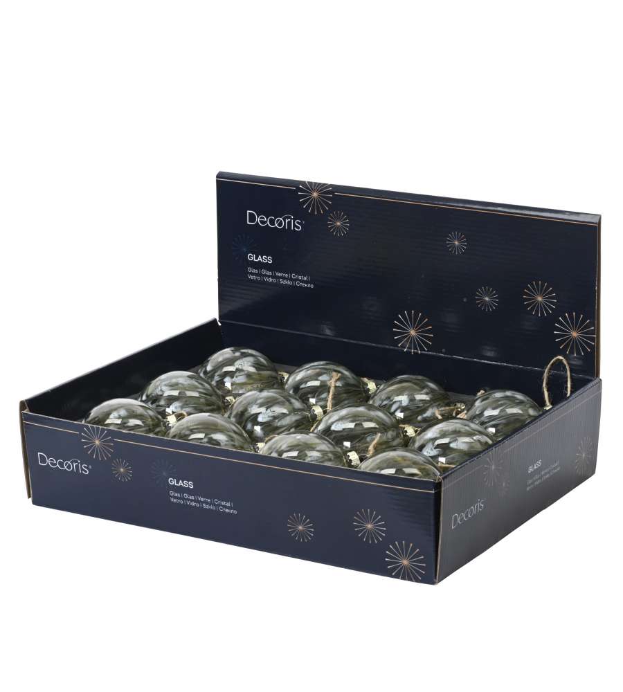 Descrizione: Sfera natalizia Decoris diametro 8 cm in vetro trasparente, decorata in verde rosmarino. Perfetta per un'atmosfera incantevole, con cappuccio in metallo e filo di juta. Ideale per decorazioni interne.