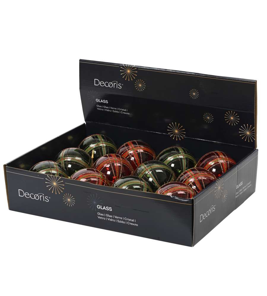 Pallina di Natale in vetro trasparente con glitter, disponibile in rosso o verde. Diametro 8 cm, leggera e facile da appendere. Design elegante con linee incrociate che catturano la luce, ideale per decorare alberi e ghirlande.Altro 1: