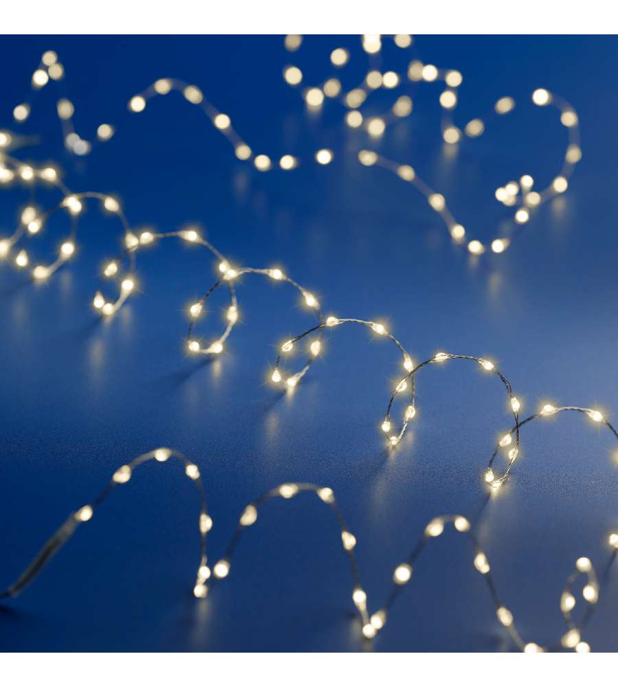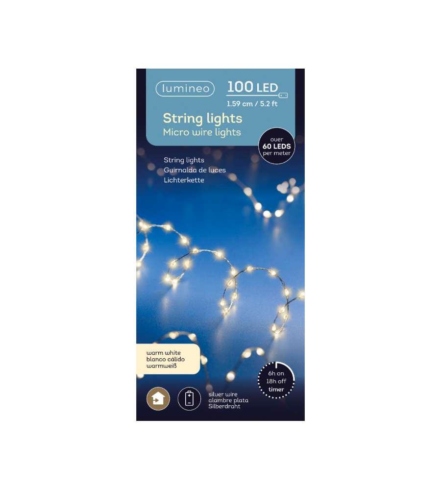 Descrizione: Ghirlanda luminosa a LED Lumineo Extra Densa, 159 cm, con filo argentato e 100 Micro LED bianco caldo. Funzionamento a batterie, timer 6 ore, ideale per decorazioni interne eleganti.