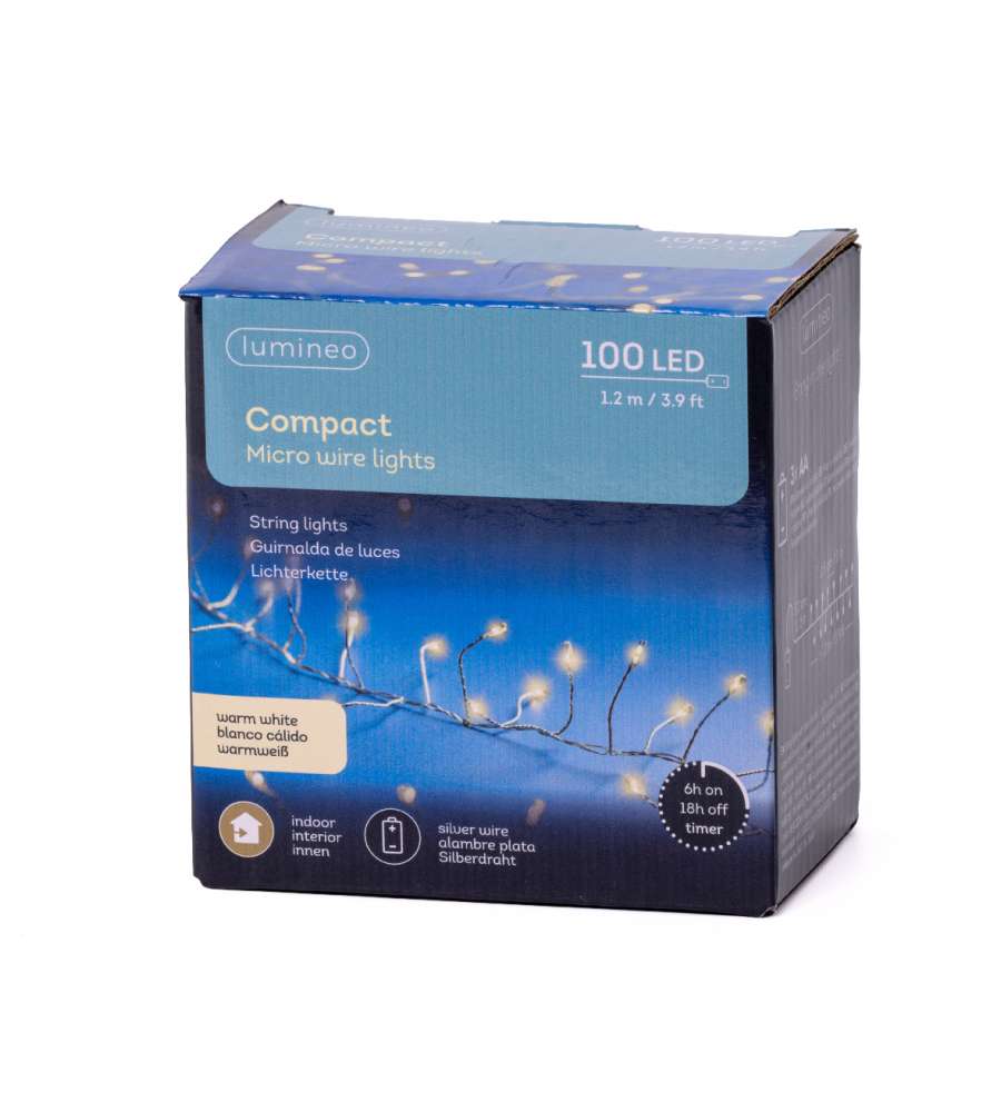 Descrizione: Ghirlanda luminosa LED Lumineo da 120 cm con cavo argento e 100 micro LED bianchi caldi. Perfetta per decorazioni interne, con timer integrato e funzionamento a batteria. Eleganza e praticità.