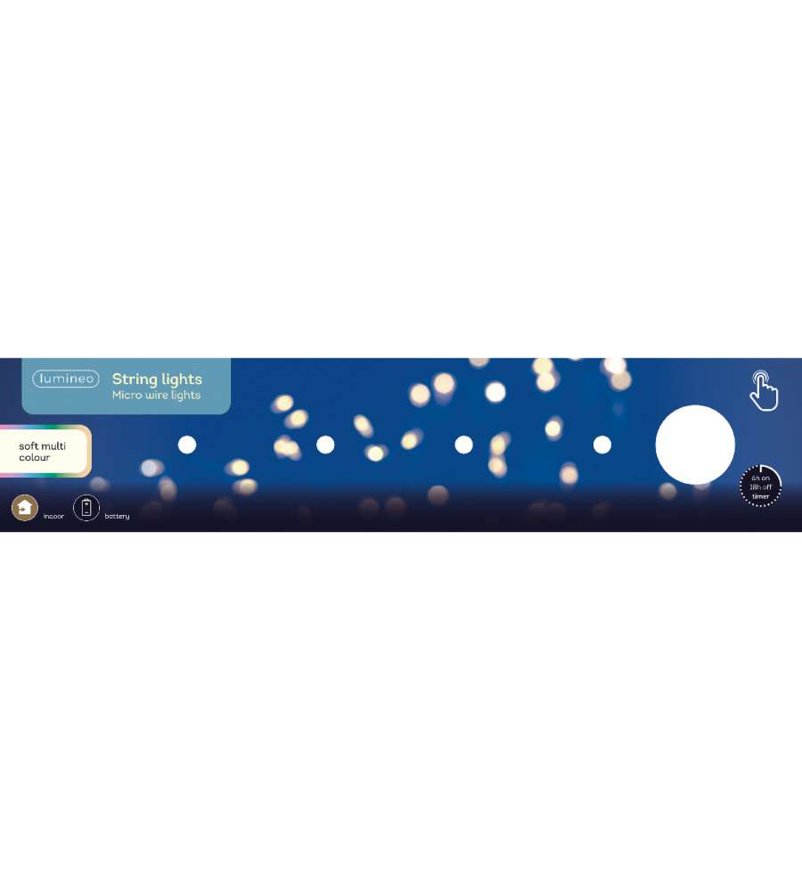 La ghirlanda luminosa Lumineo è perfetta per creare un'atmosfera accogliente e festiva. Grazie ai suoi LED multicolore soft, dona un tocco di eleganza e vivacità agli ambienti interni. Il timer integrato consente un utilizzo pratico e senza preoccupazioni, mentre il funzionamento a batterie la rende versatile e facile da posizionare ovunque.