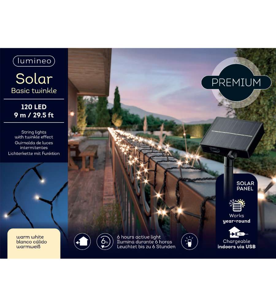 Descrizione: Illumina il tuo spazio con il Filo 120 luci LED solari Lumineo. Lungo 9 m, offre 120 micro LED bianchi caldi e 8 effetti luminosi. Pannello solare con autonomia di 6 ore, perfetto per esterni!