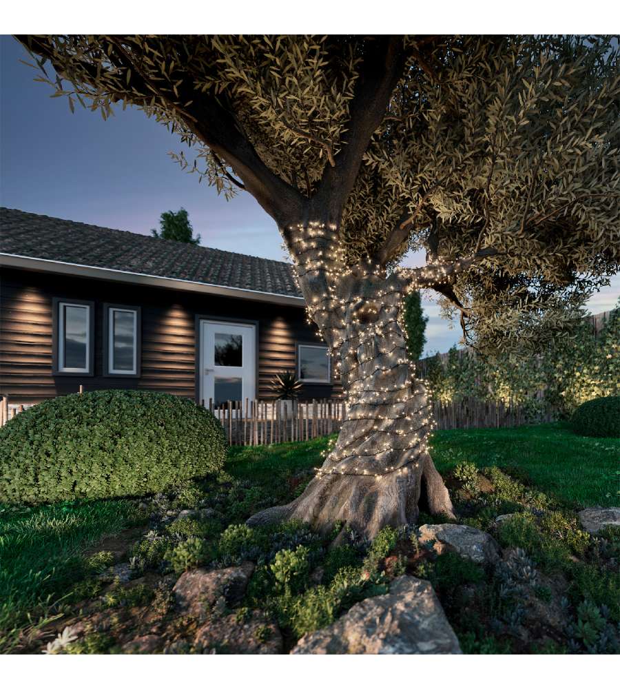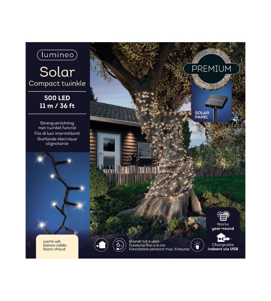 Descrizione: Illumina il tuo spazio con il Filo 500 luci LED solari compatte Lumineo! Con 1100 cm di lunghezza e 8 effetti luce, crea atmosfere natalizie uniche! Pannello solare per 6 ore di autonomia. Colore luce bianco caldo.