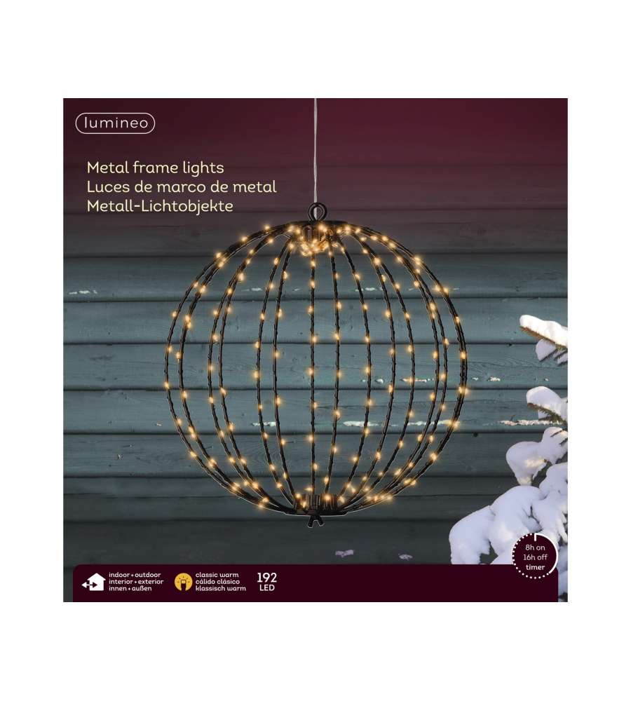 Sfera in metallo da 28 cm con 192 luci LED bianco caldo, ideale per decorazioni natalizie all'esterno. Cavo da 500 cm, resistente agli agenti atmosferici (IP-44), colore nero.Uso esterno: