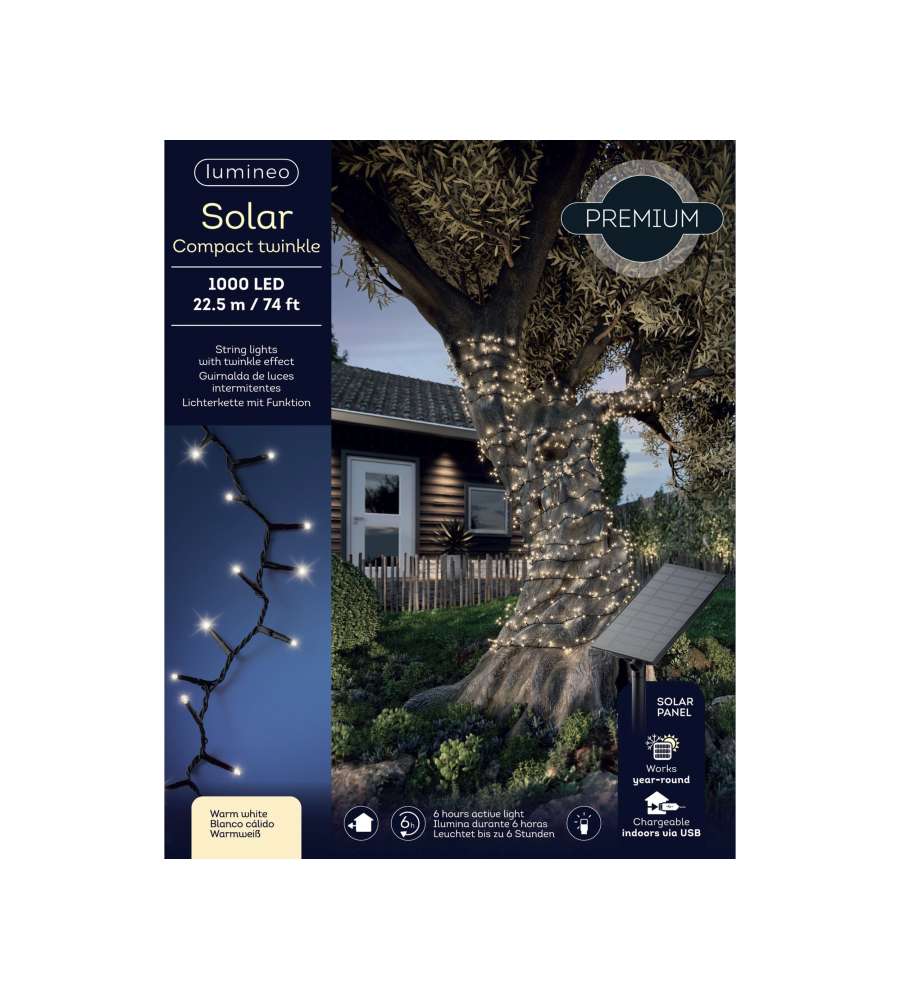 Descrizione: Stringa luminosa solare Lumineo da 2250 cm con 1000 LED bianco caldo, effetto Twinkle a 8 funzioni, alimentazione solare e batteria sostituibile. Perfetta per decorare il tuo giardino.