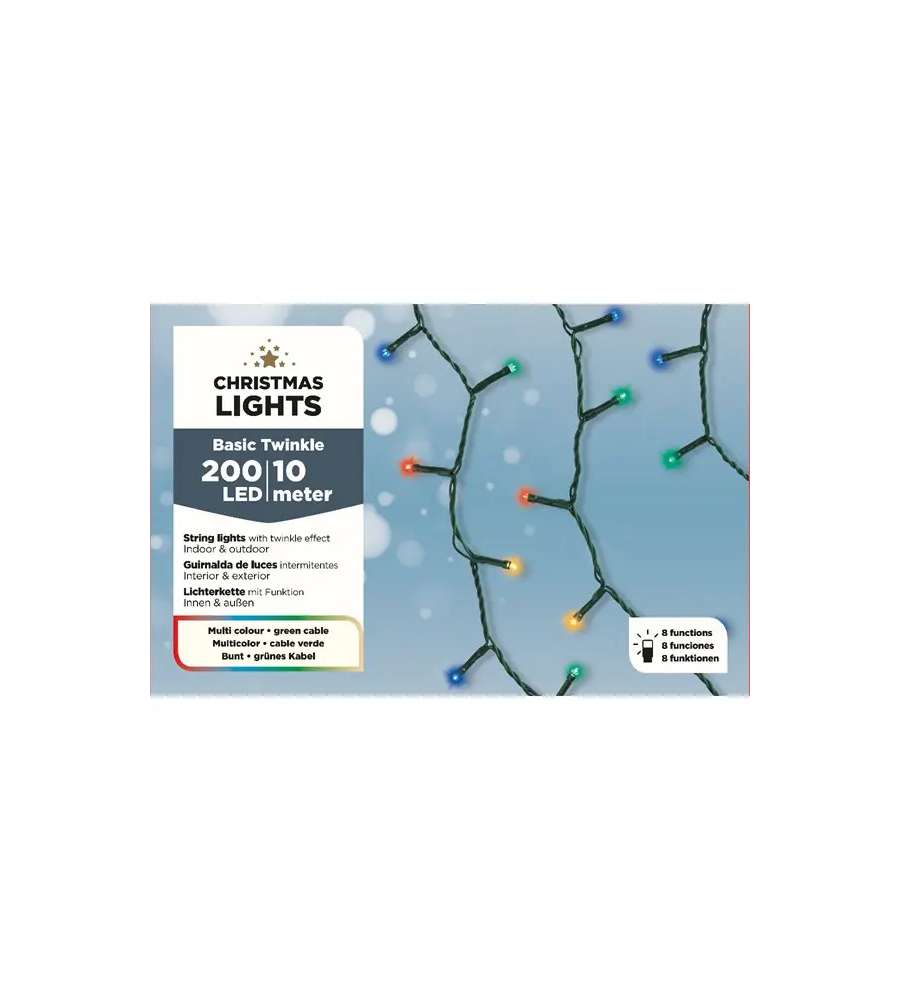 Luci Natale 200 LED multicolor: 200 luci LED, colore multicolor, adatte per interno ed esterno, lunghezza 9,95 m, 8 effetti luce, cavo spina UE 300 cm, IP44.Uso interno: