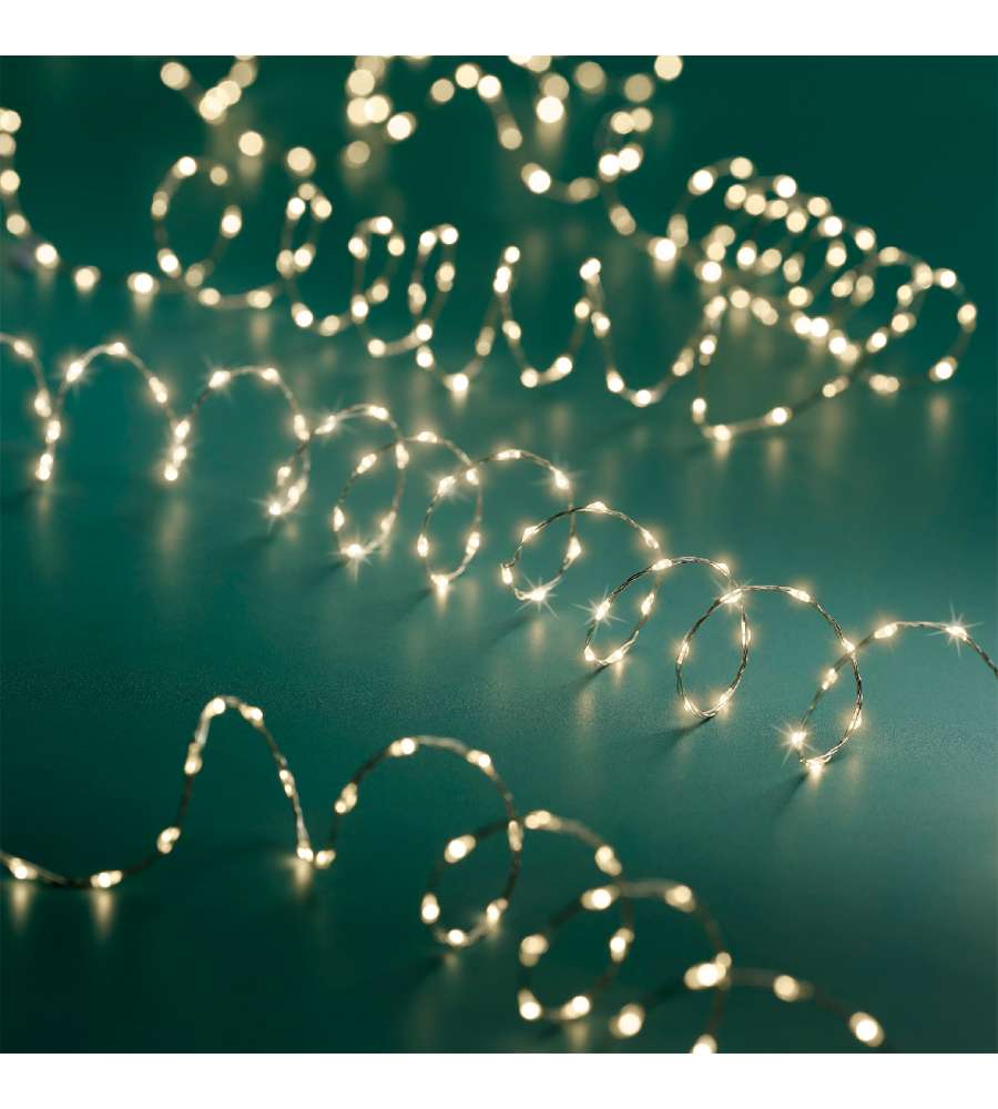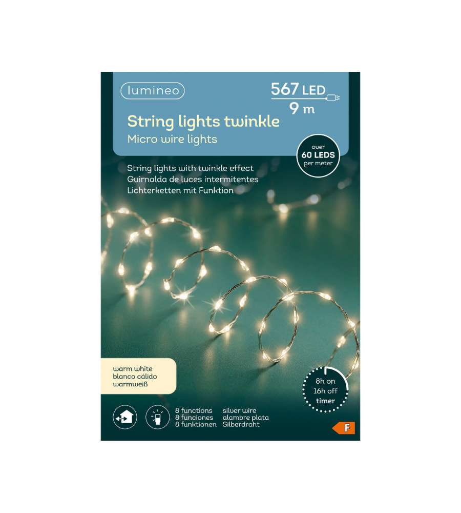 Filo LED da 9 m con 567 micro luci bianche calde, struttura in PVC, colore argento. IP-44, adatto per uso interno ed esterno. Trasformatore incluso, 8 effetti luce per creare atmosfere uniche. Timer 8 ore ON, 16 ore OFF.Uso interno: