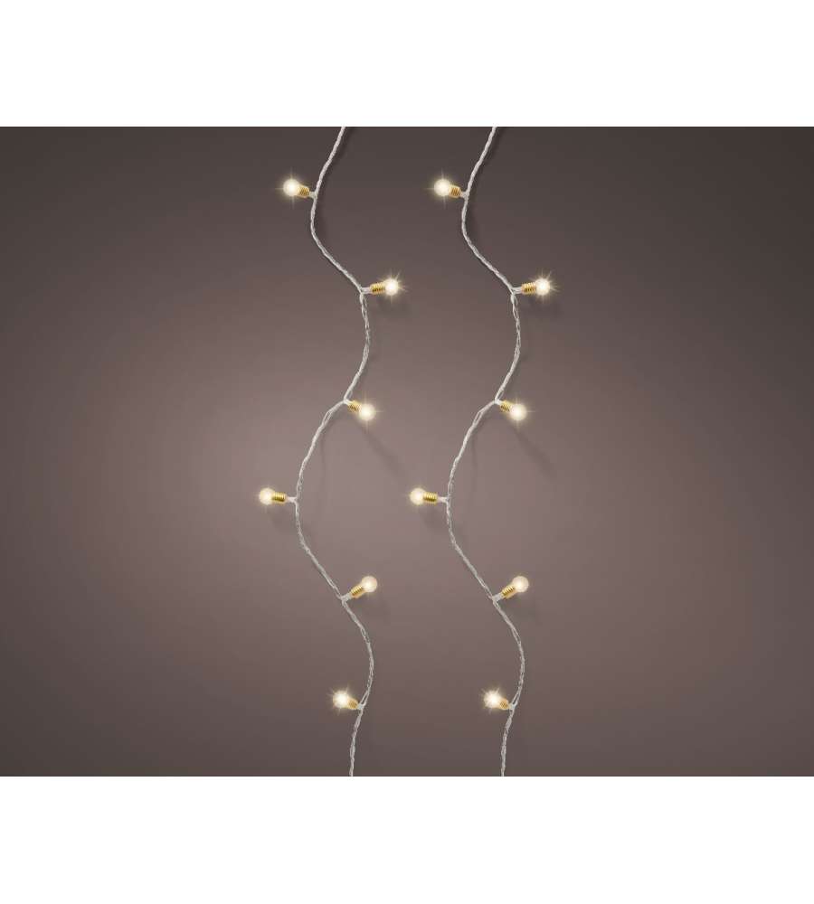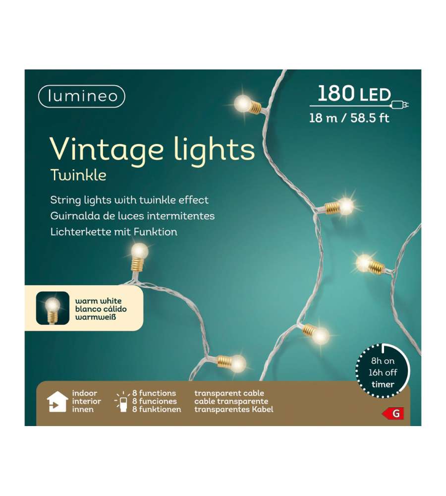 Descrizione: Luci LED vintage Lumineo, bianco caldo, 18 m, perfette per decorazioni natalizie interne. Effetto Twinkle, timer 8 ore, 180 LED su cavo trasparente per un'atmosfera accogliente e festosa.