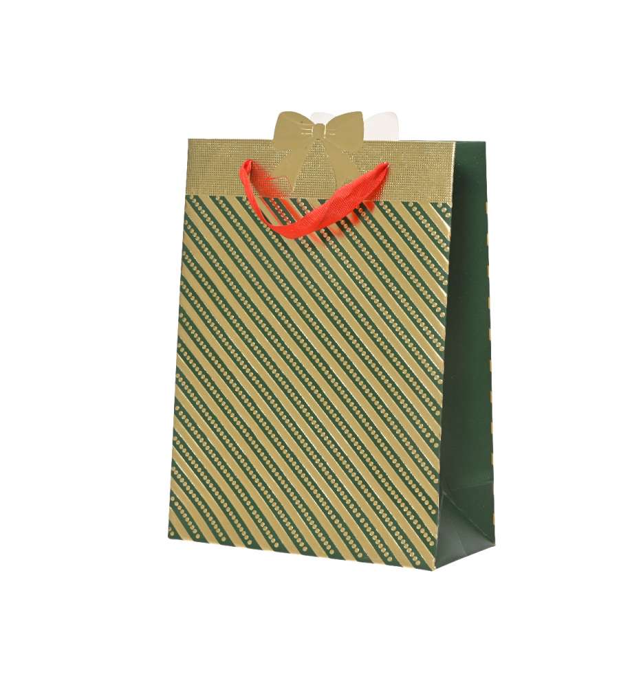 Descrizione: Decoris giftbag in carta verde e oro, elegante e pratica per confezionare regali natalizi. Dimensioni 10x26x32 cm, design raffinato con dettagli dorati, perfetta per ogni occasione speciale.