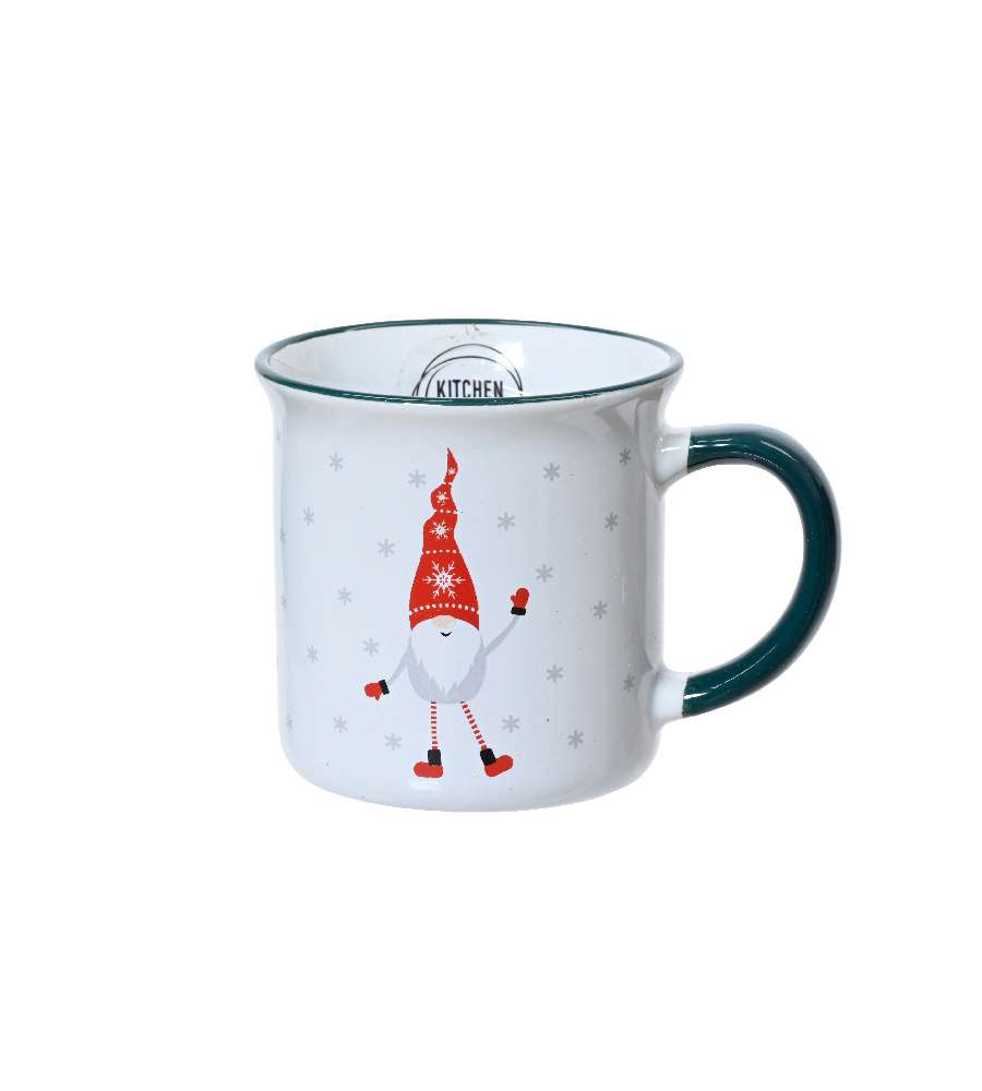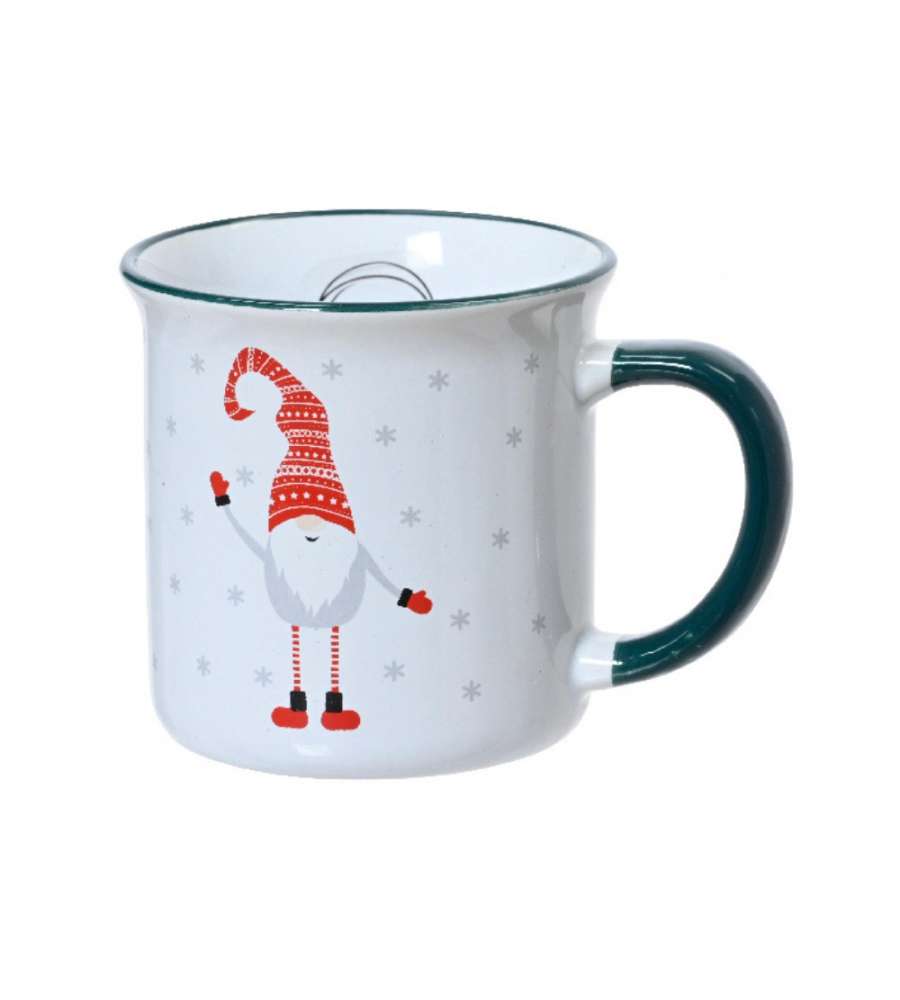 Tazza natalizia in gres con decoro gnomo. Dimensioni: 8,9x8,7 cm. Grafica in decalcomania. Foodsafe, lavabile in lavastoviglie, non adatta al microonde.