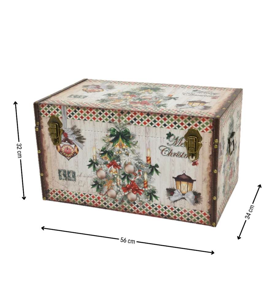 Baule decorativo natalizio effetto vintage, dimensioni 56x34x32 cm, con coperchio, maniglie e chiusura in colore ottone anticato. Realizzato in MDF, rivestito in PVC e fodera in poliestere, ideale per uso interno.Uso interno: