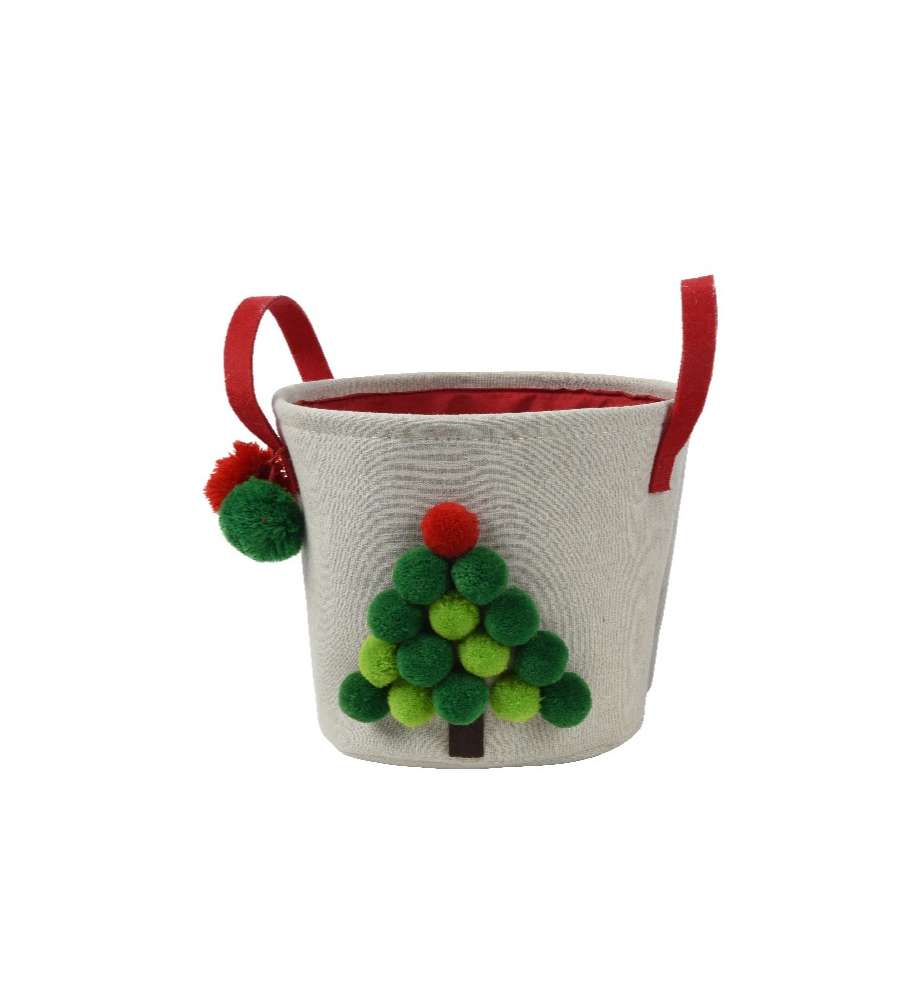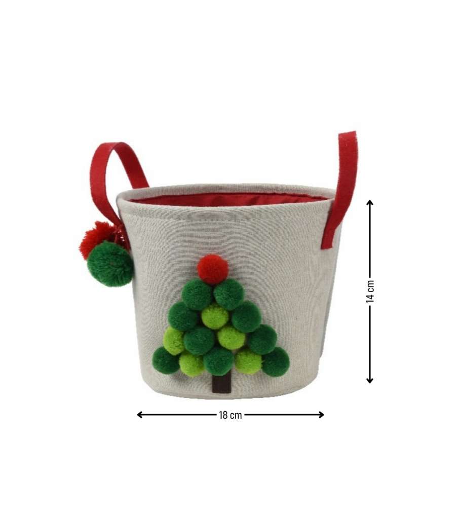 Descrizione: Cesto rotondo in poliestere con manici, decorato con un festoso albero di Natale e pompon. Perfetto per l'organizzazione. Un tocco artigianale per le tue decorazioni natalizie!