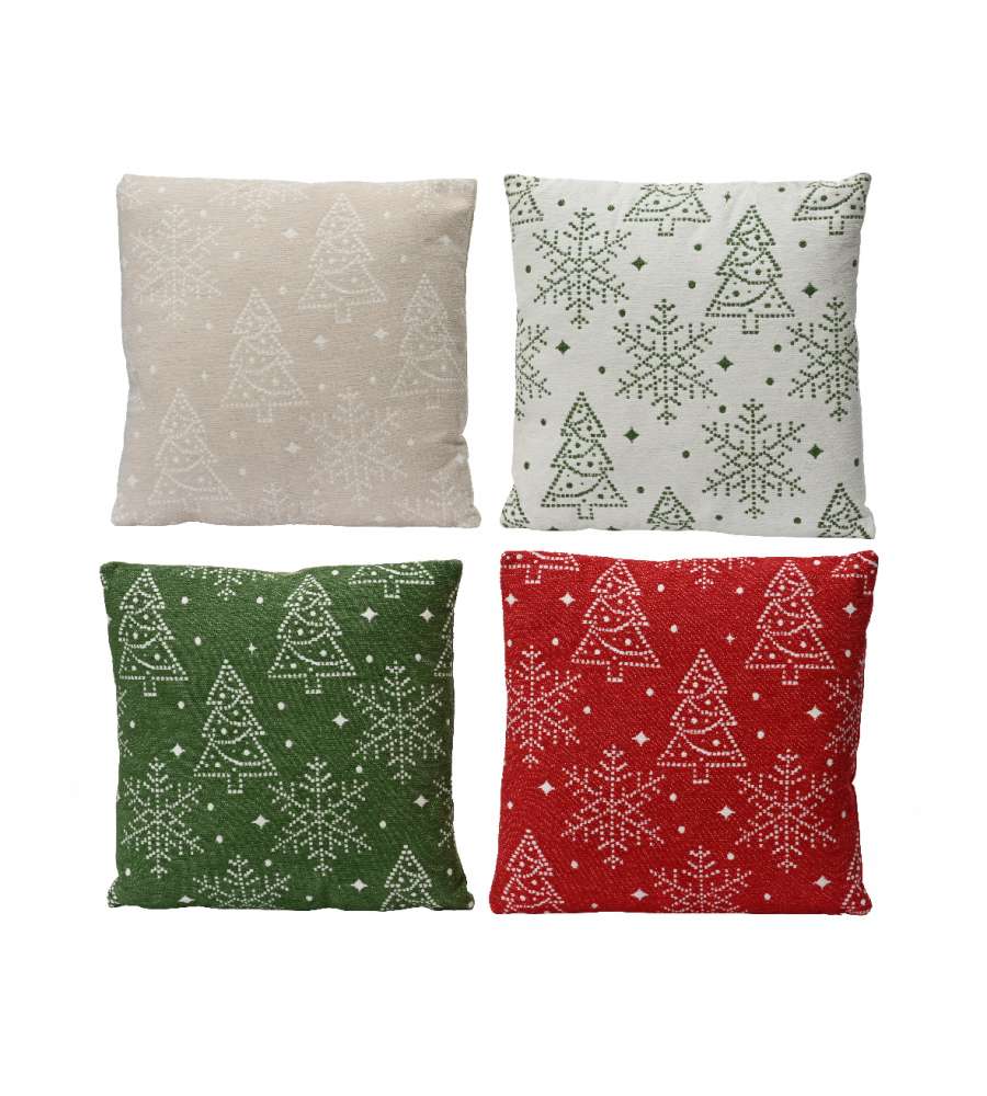 Cuscino decorativo natalizio in velluto 100% poliestere (70% riciclato), finitura jacquard. Misura 40x40 cm, disponibile in colori assortiti: verde, bianco, rosso, beige. Ideale per decorare interni. Forma quadrata.Uso interno: