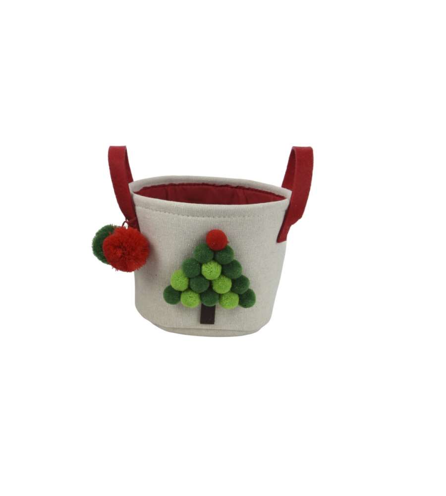 Cesto Decoris Beige, 25x20.5 cm, in poliestere con pompon decorativi. Elegante e funzionale, ideale per riporre oggetti e decorare la casa con un tocco accogliente e festoso.