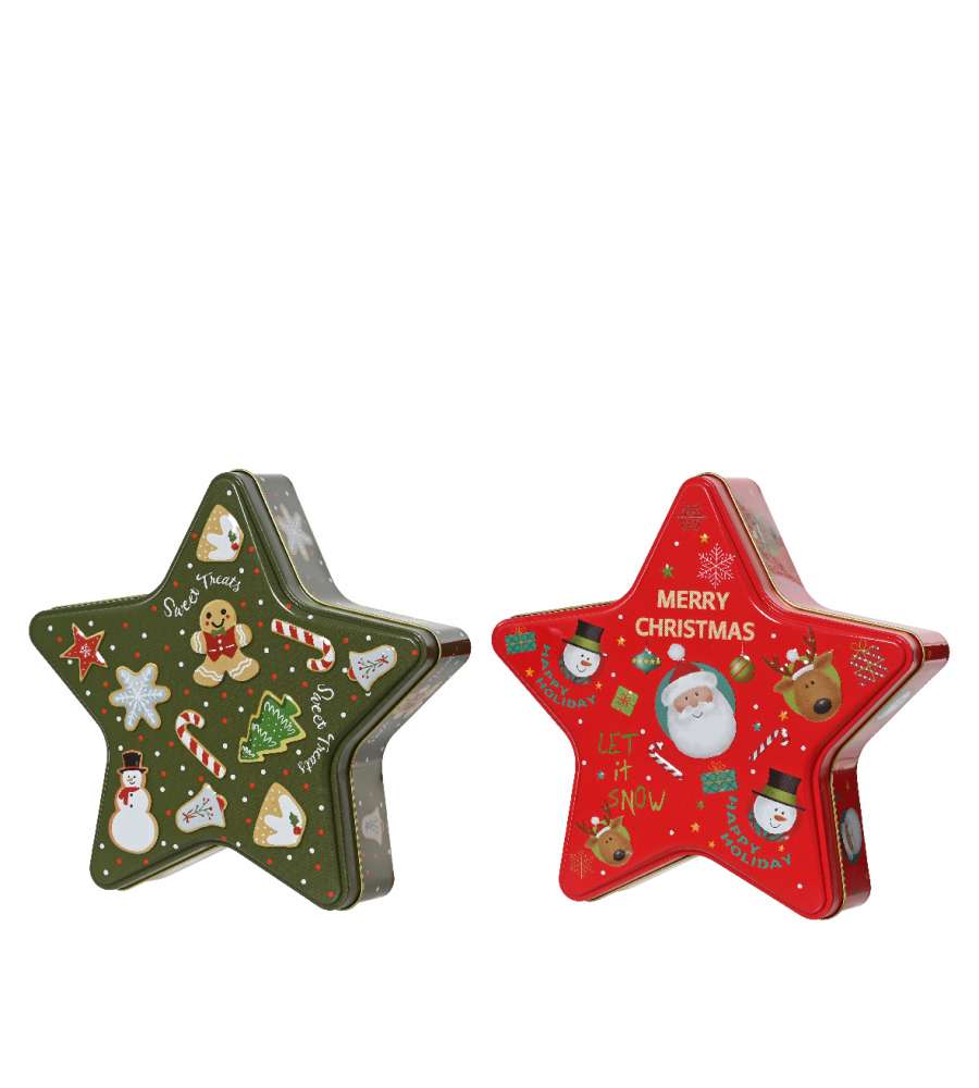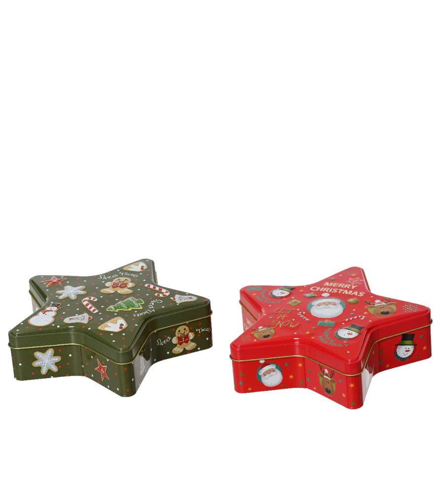 Contenitore Decoris Stella in latta multicolore, 19x18,5x5 cm, con motivo in rilievo e finitura stampata UV. Elegante e funzionale, ideale per organizzare e decorare spazi interni.