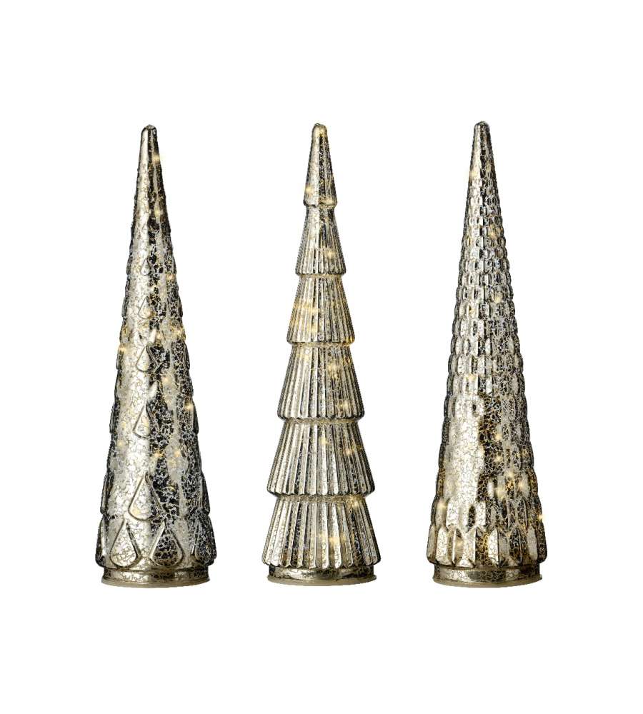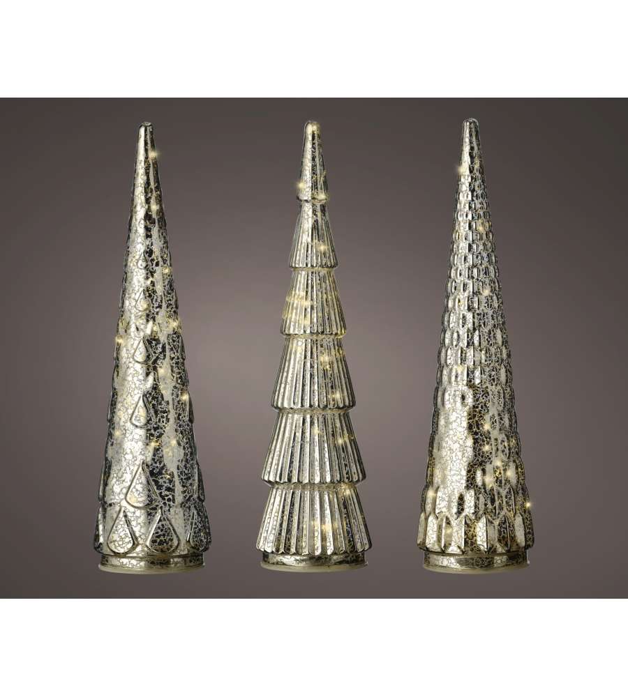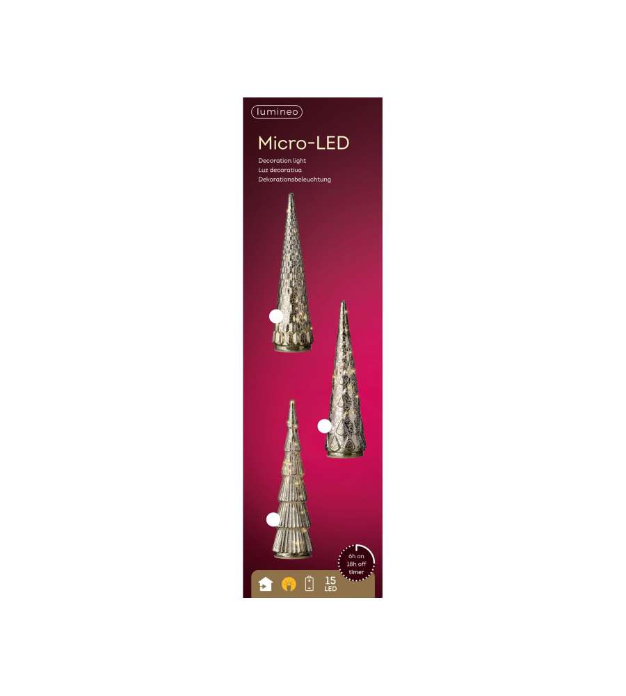 Mini albero di Natale in vetro trasparente con 15 micro-LED bianchi caldi. Finitura silver anticata per un effetto retrò, funzionamento a batteria con timer (6 ore ON, 18 ore OFF). Solo per interni, autonomia di 48 ore. Dimensioni 9x33 cm.Uso interno: