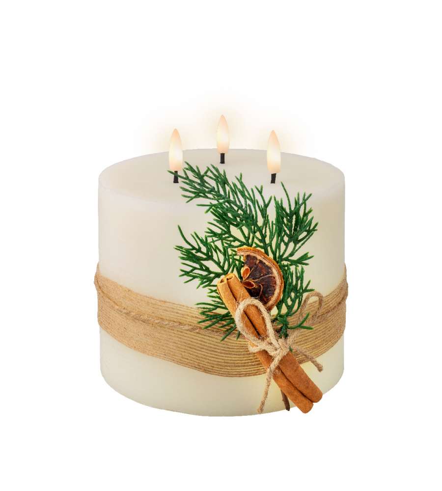 Candela LED Lumineo Beige 15cm con decorazioni a foglie, luce calda realistica, timer 6 ore, alimentata da 3 batterie AA, perfetta per interni.