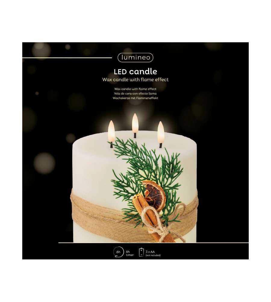 Descrizione: Candela LED Lumineo Beige 15 cm con decorazione a foglie, luce calda e timer 6 ore. Elegante e pratica, ideale per creare un'atmosfera accogliente in casa. Alimentata a batterie.