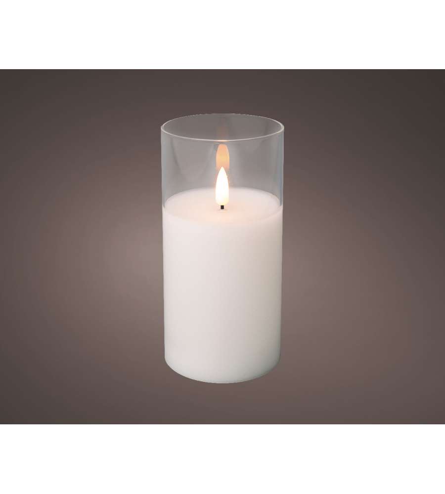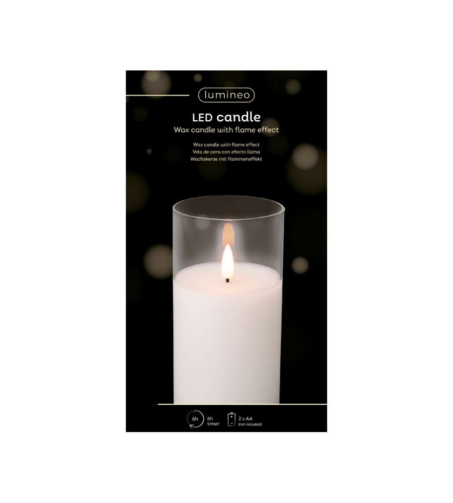 Candela LED bianca con effetto fiamma in bicchiere di vetro, ideale per decorazioni natalizie. Funziona con 2 batterie AA, timer di 6 ore, luce bianca calda. Dimensioni: D. 7,5 x h 15 cm, peso 440 g. Sicura per interni, certificata EN62471 e RoHs.Materiale struttura: