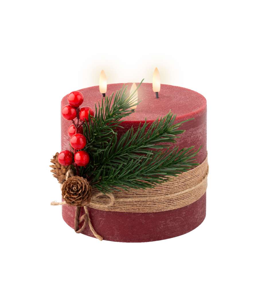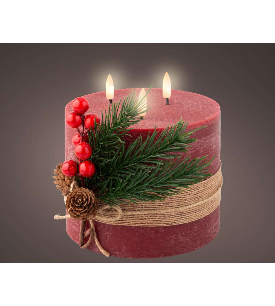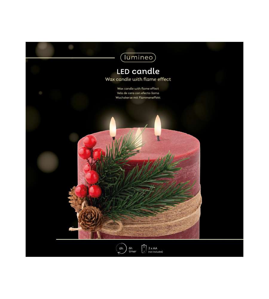 Descrizione: Candela LED Lumineo rossa 15 cm in cera autentica con effetto fiamma reale. Timer 6 ore, luce bianco caldo, ideale per interni. Eleganza e sicurezza per un'atmosfera accogliente.