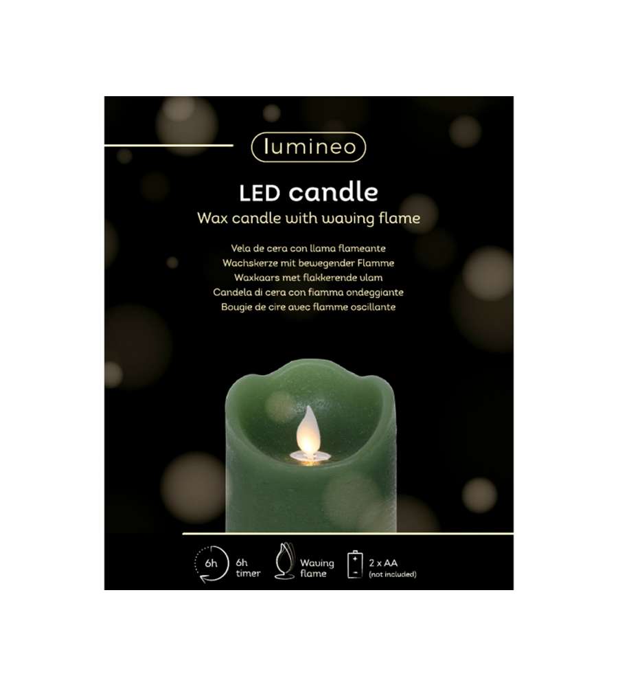 Descrizione: Candela LED verde Lumineo 10 cm in cera con effetto fiamma ondeggiante. Atmosfera calda e accogliente, ideale per interni. Funziona a batteria, durata 400 ore, perfetta per ogni occasione.