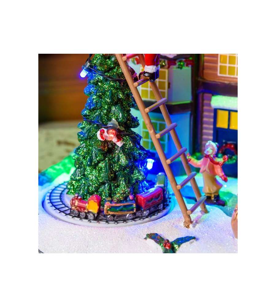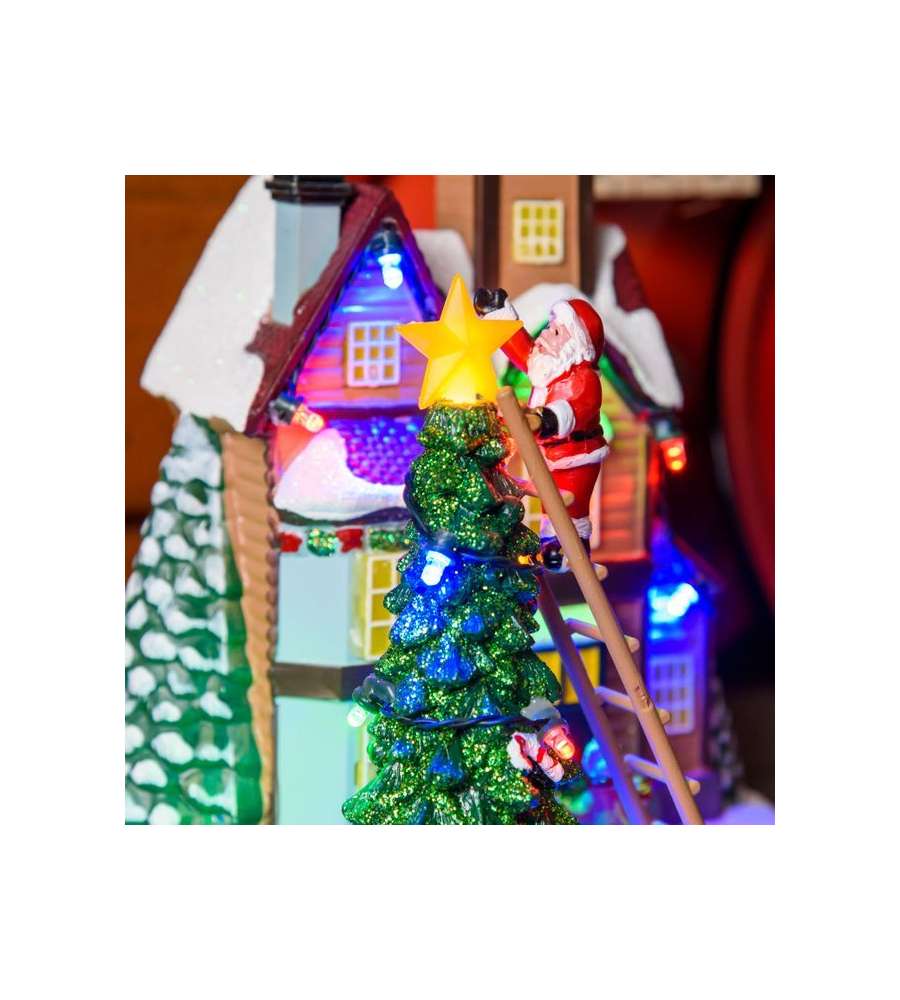 Descrizione: Casetta innevata Lumineo con Babbo Natale e trenino, illuminata da 13 LED multicolori. Realizzata in poliresina, crea un'atmosfera festiva con movimento, luci e musica. Dimensioni 16x19x22 cm, batterie incluse.