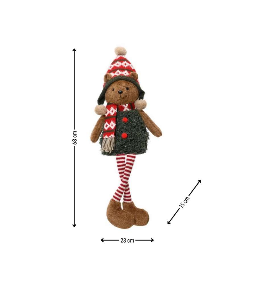 Morbido orso natalizio in poliestere, con cappellino e dettagli festivi. Perfetto per decorare la tua casa durante le festività, aggiungendo un tocco di calore e allegria. Orso marrone, rosso, verde e bianco, dimensioni 23x15x68 cm.Uso interno: