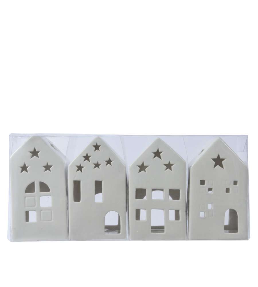 Set di 4 portacandele in porcellana bianca a forma di casetta natalizia, altezza 16 cm. Ideali per decorare la casa durante le festività, con certificazioni di sicurezza per l'uso di candele. Perfetti per un'atmosfera invernale.Uso interno: