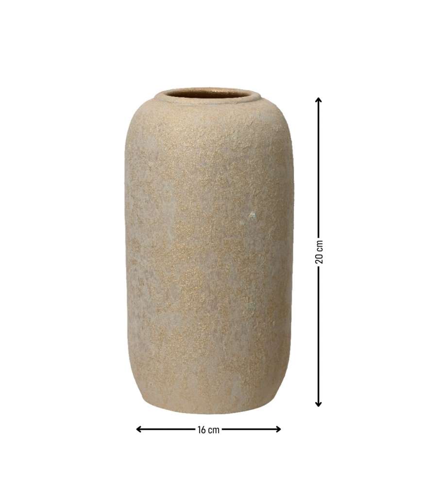 Vaso decorativo in terracotta fatto a mano con finitura oro elegante, ideale per interni. Dimensioni: D. 16 cm x H. 30 cm, peso 2,7 kg. Perfetto per decorazioni natalizie e per aggiungere un tocco di classe agli ambienti. Non resistente all'acqua.Uso interno: