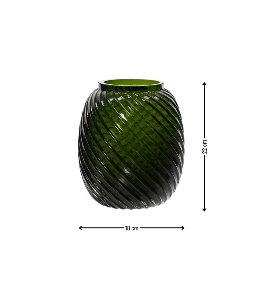 Vaso in vetro verde con lavorazione a spirale in rilievo, dimensioni 18x22 cm. Ideale per decorazioni interne, aggiunge un tocco elegante a ogni ambiente. Perfetto per fiori freschi o secchi, un elemento distintivo per la tua casa.Uso interno: