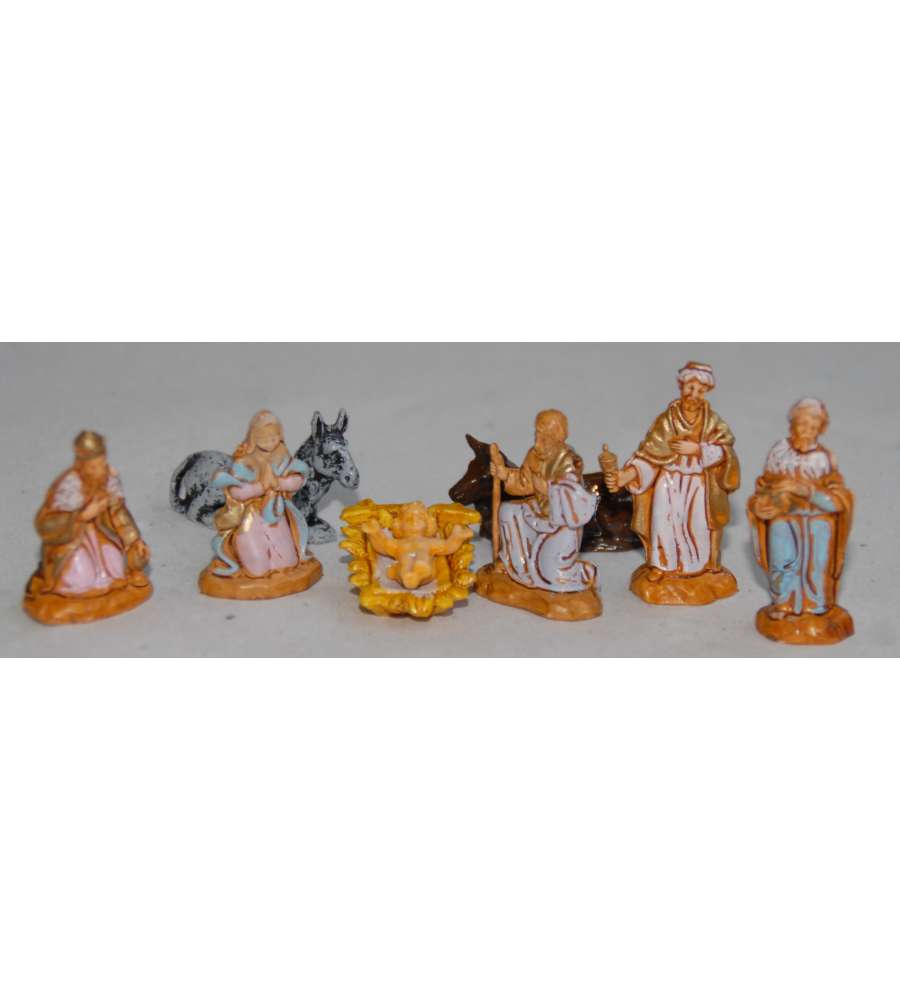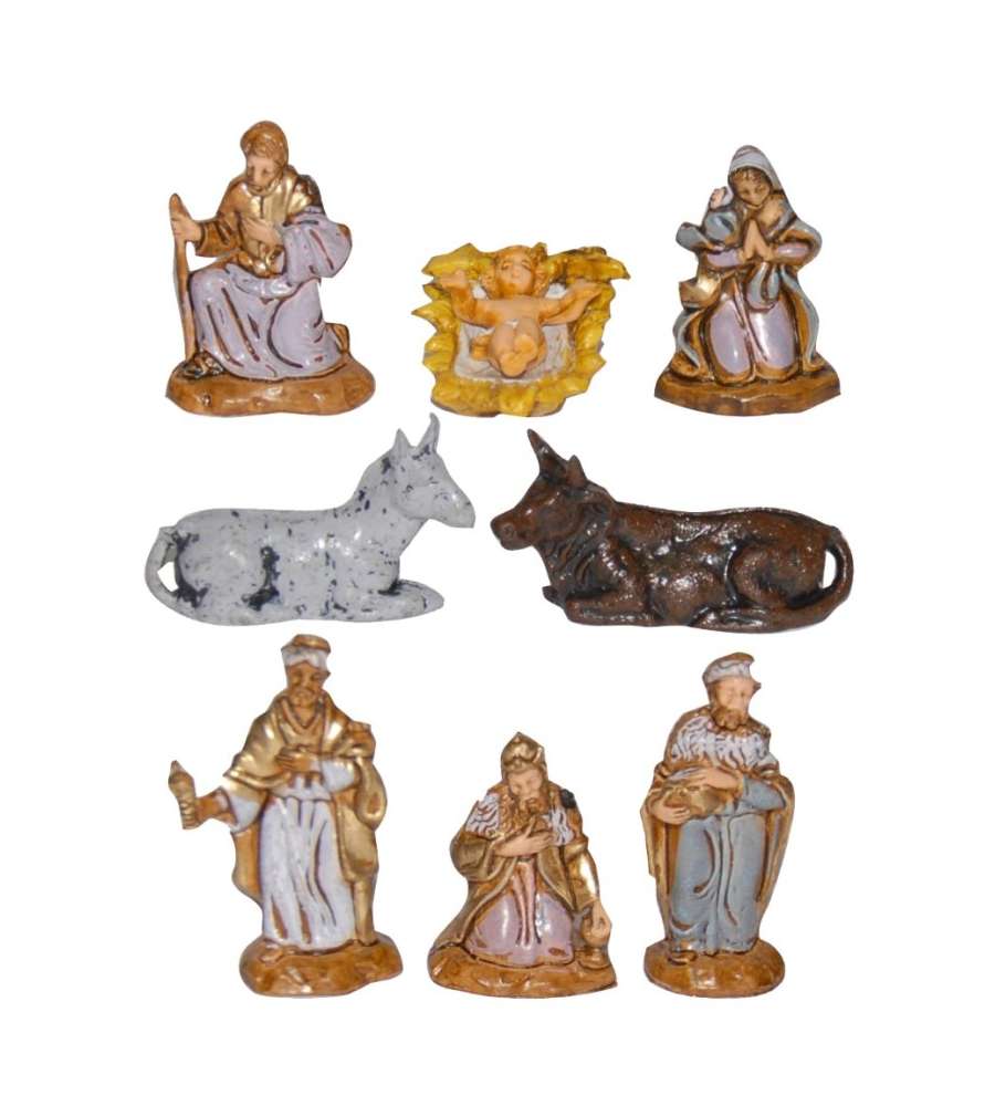 Set di 8 figure della natività alte 3,5 cm, dipinte con colori vivaci. Include la Madonna, San Giuseppe, il bambino Gesù, i tre re magi, il bue e l'asinello.Uso interno: