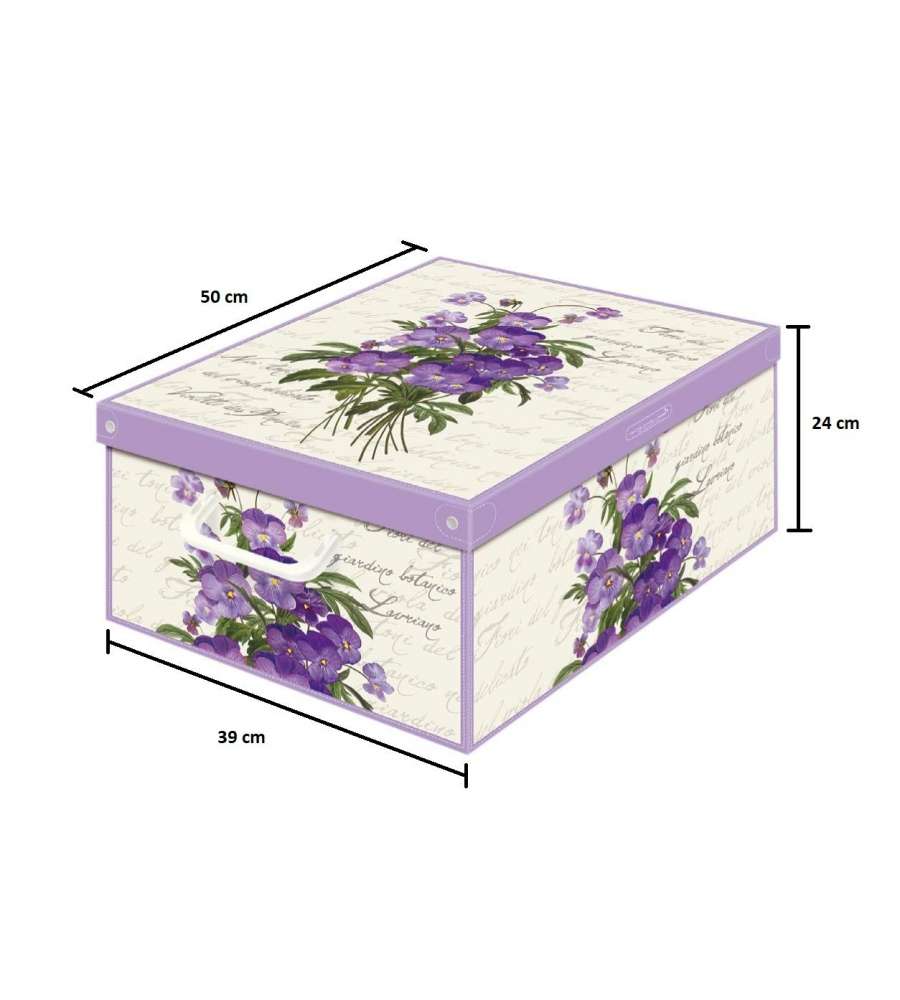 Scatola componibile in cartone decorato plastificato, dimensioni 39x50x24 cm, con maniglie in plastica robusta. Montaggio semplice senza bottoni, coperchio con rivetti in acciaio. Lavabile e ideale per organizzare vestiti e biancheria. Profumata alleUso interno: