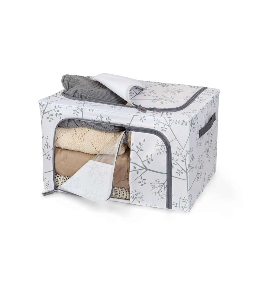 Scatola guardaroba con doppia apertura e cerniera, struttura metallica robusta, tessuto resistente con cuciture rinforzate. Ideale per vestiti e accessori. Maniglie per il trasporto e finestra trasparente. Design moderno floreale.Indicato per: