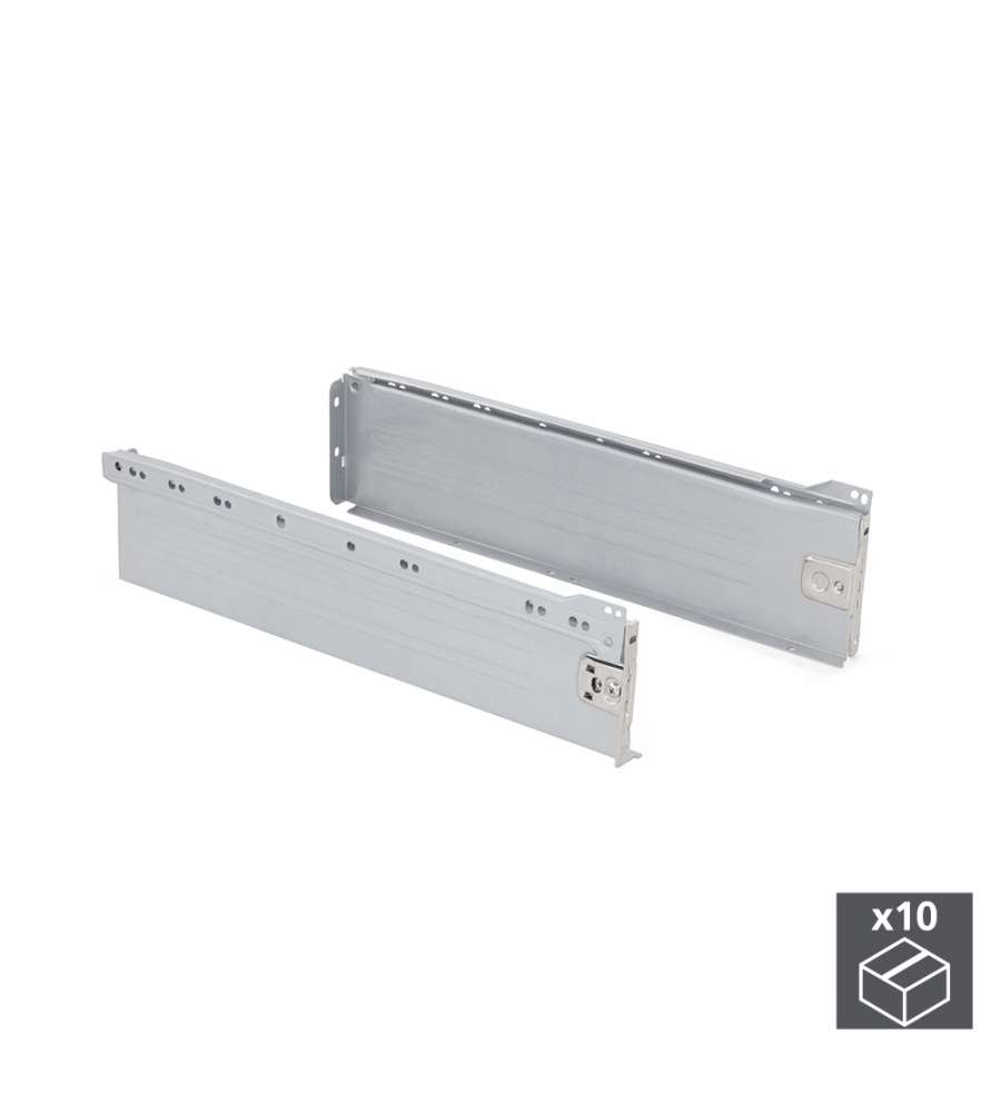 Kit cassetto Emuca Ultrabox, altezza 118 mm, profondità 350 mm. Include 10 unità. Realizzato in acciaio grigio metallizzato, ideale per cucina e bagno. Dimensioni: 26,5 x 14 x 38 cm, peso totale 11,33 kg.