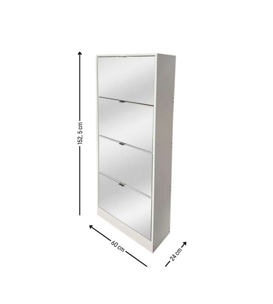 Scarpiera elegante e pratica con specchio integrato e 4 ribalte, offre ampio spazio per le scarpe. Dimensioni 60x24x152,5h cm, colore bianco. Ideale per un ingresso ordinato e stiloso, perfetta per controllare il look prima di uscire.Altro 1: