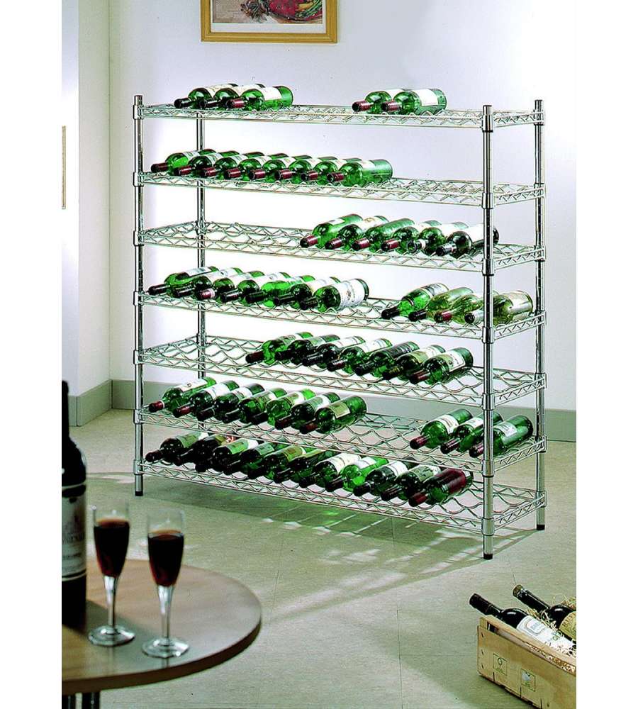 Ripiano portabottiglie in filo d'acciaio cromato per scaffalature Archimede System. Dimensioni: 91 x 36 cm, capacità 9 bottiglie. Include 1 ripiano, 4 clip di montaggio e guancette per fissaggio. Installazione libera, colore grigio.Altro 1: