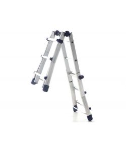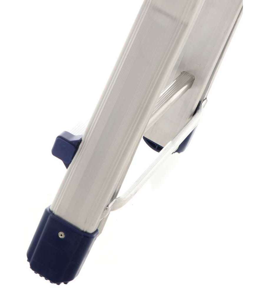 Descrizione: Struttura in alluminio a 4 + 4 gradini rinforzata con piedini antiscivolo, manopole bombate e gancio laterale in acciaio. Portata 100 kg. Certificato ACAL 100 e conforme al D.Lgs. 81/08.