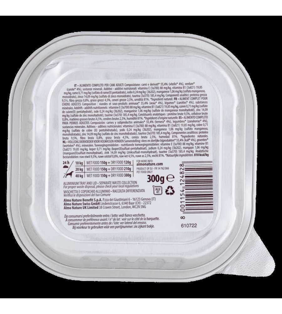 Almo Nature Alimento Umido per Cani Adulti Vitello e Carote è una scelta eccellente per chi desidera offrire al proprio amico a quattro zampe un pasto nutriente e sano. Grazie alla combinazione di carne di vitello e carote, questo alimento fornisce proteine di alta qualità e vitamine essenziali, contribuendo al benessere generale del tuo cane. La sua ricetta senza glutine lo rende ideale anche per cani con sensibilità alimentari. Inoltre, la consistenza del patè lo rende facilmente masticabile e appetitoso, perfetto per i cani più esigenti. Consigliamo di servire il prodotto a temperatura ambiente per esaltarne il gusto e l'aroma.