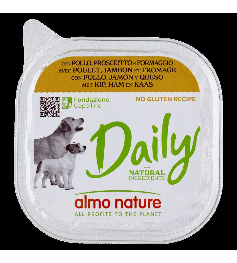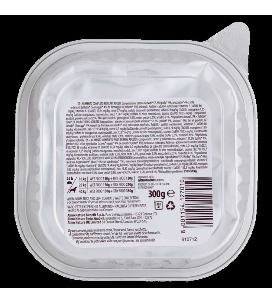 Alimento completo per cani adulti, con pollo (4%), prosciutto (4%) e formaggio (4%). Preparato con ingredienti naturali, senza glutine e ricco di minerali. Formato da 300 g, ideale per taglie piccole e medie.Ingredienti principali: