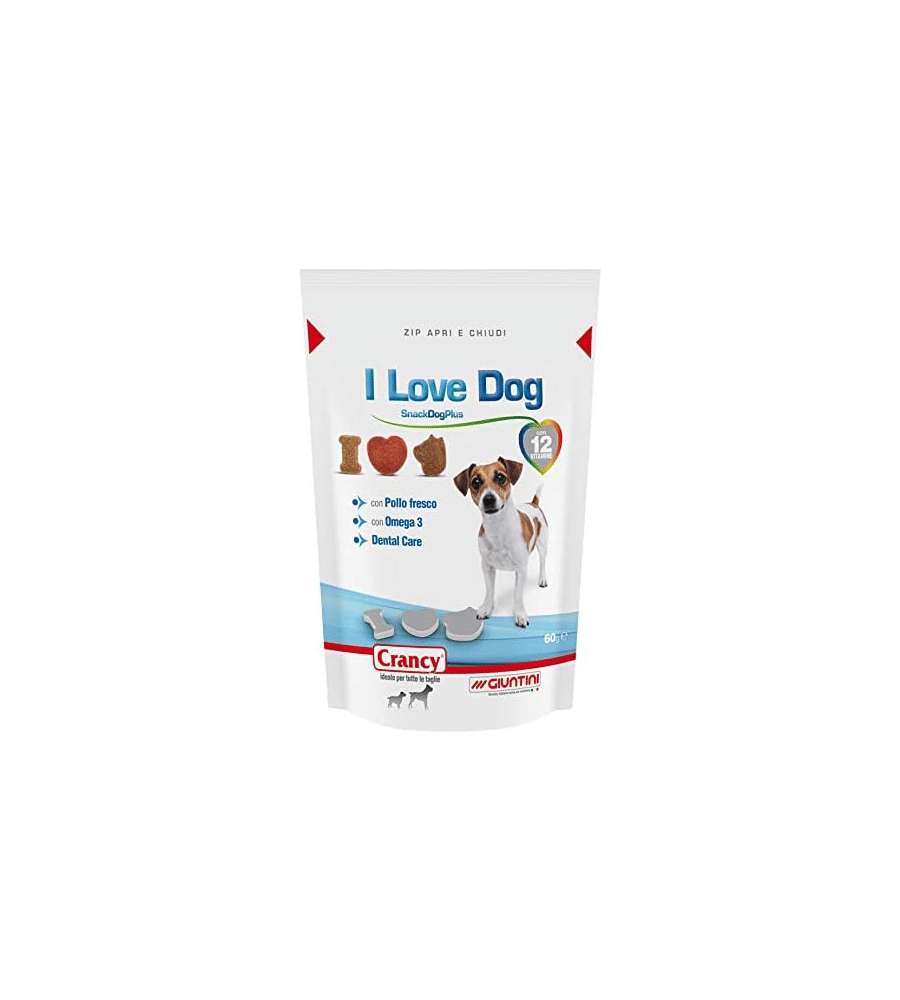 Descrizione: Snack per cani Crancy I Love Dog 60g, ricco di carne fresca e 12 vitamine. Ideale per tutte le taglie, favorisce l'igiene orale grazie alla fibra insolubile. Snack gustoso da somministrare in qualsiasi momento!