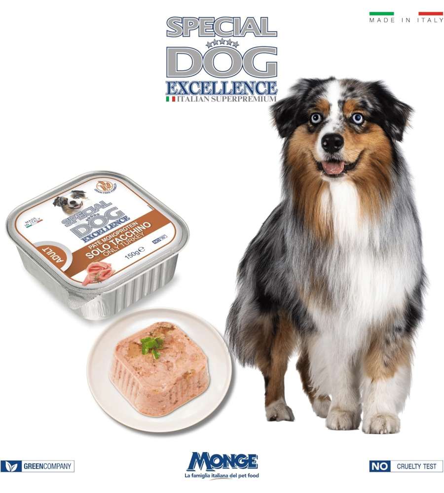 Descrizione: Paté monoproteico al tacchino Special Dog da 150 g, realizzato con 100% di carne fresca. Prodotto di alta qualità, origine Italia. Perfetto per un'alimentazione sana e gustosa del tuo cane.