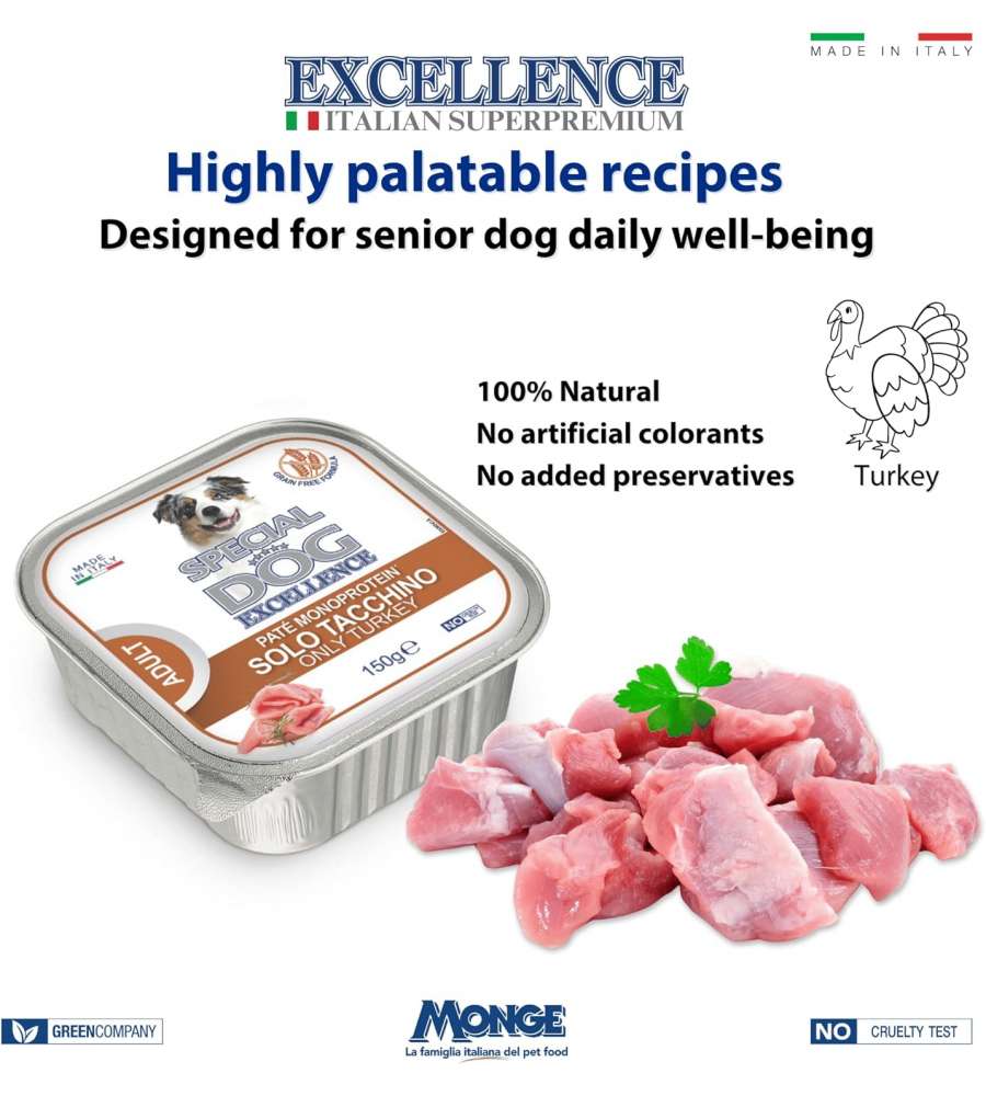 Paté monoproteico al tacchino, 150 g, con il 100% di carne fresca di tacchino. Prodotto di alta qualitŕ, origine Italia. Ideale per cani con esigenze alimentari specifiche. Pratico formato da gestire.Ingredienti principali: