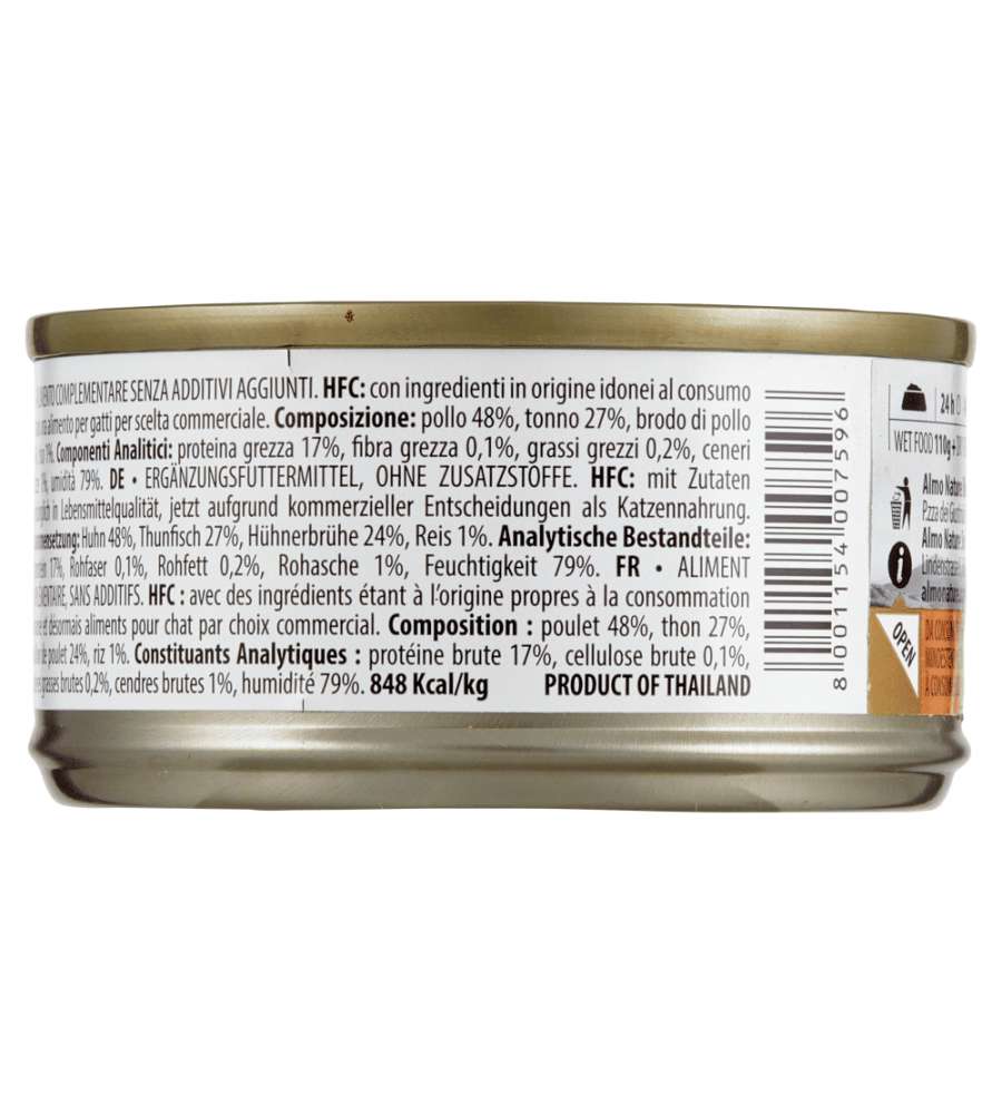 Alimento umido per gatti, senza additivi. Composto da pollo (48%) e tonno (27%), arricchito con brodo di pollo (24%) e riso (1%). Confezione da 70 g, energia 848 Kcal/kg. Per gatti di tutte le età, ideale per variare la dieta.Composizione: