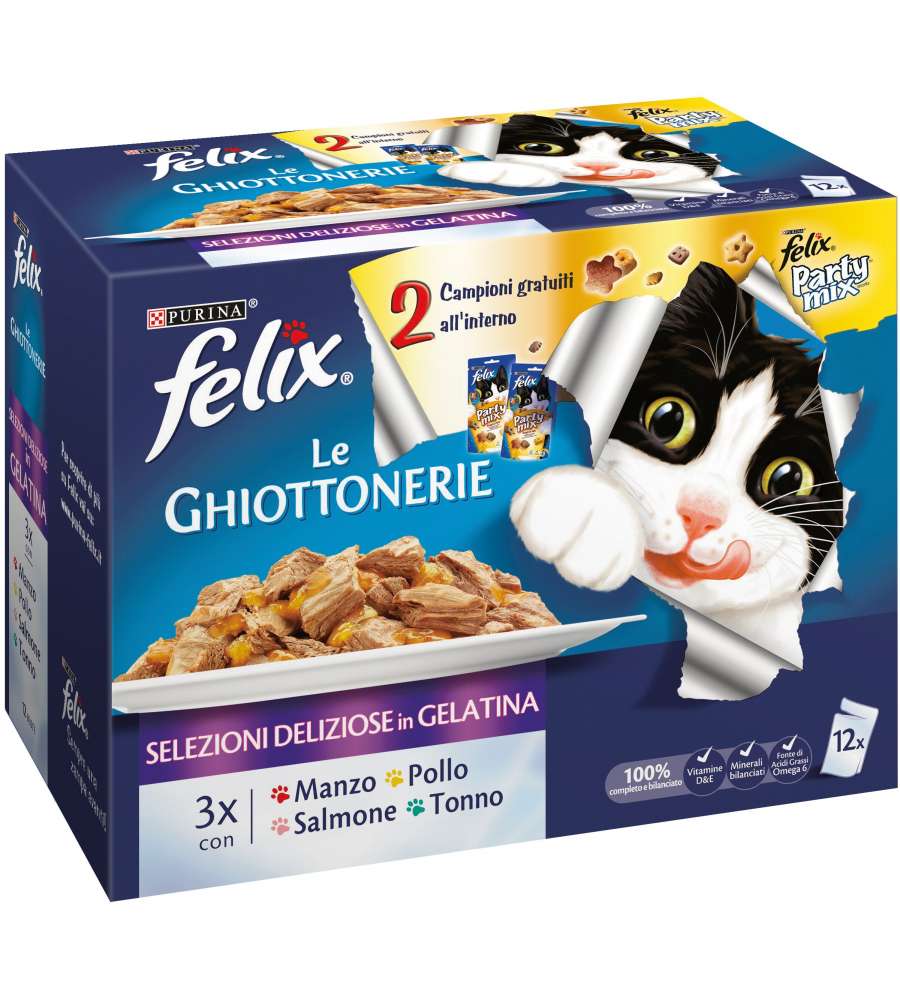 Felix Multipack 12 Buste Gr 100 + Snack. Mangime Per Gatti alimento completo per gatti adulti. Ogni Ricetta è preparata con teneri bocconcini in gelatina. Senza aromi, addittivi e colornati aggiunti.Altro 1: