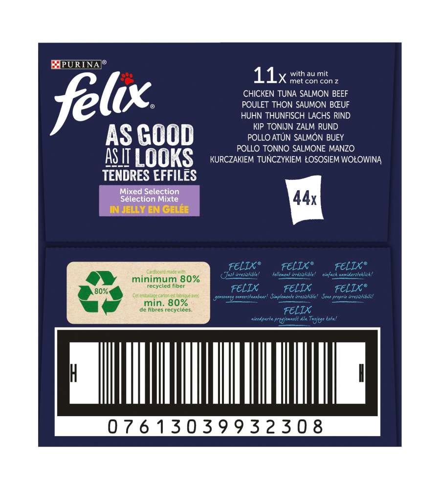 Descrizione: Scopri Felix Le Ghiottonerie in una maxi confezione conveniente: 44 bustine di bocconcini per gatti in gusti irresistibili come manzo, salmone, pollo e tonno. Pezzettini di carne in gelatina, un delizioso pasto per il tuo felino!