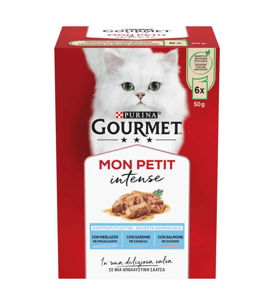 Descrizione: Cibo umido Gourmet Mon Petit per gatti, con merluzzo, sardina e salmone in pratiche porzioni da 50 g. Senza coloranti né conservanti, per un pasto fresco e nutriente. Perfetto per ogni gatto!