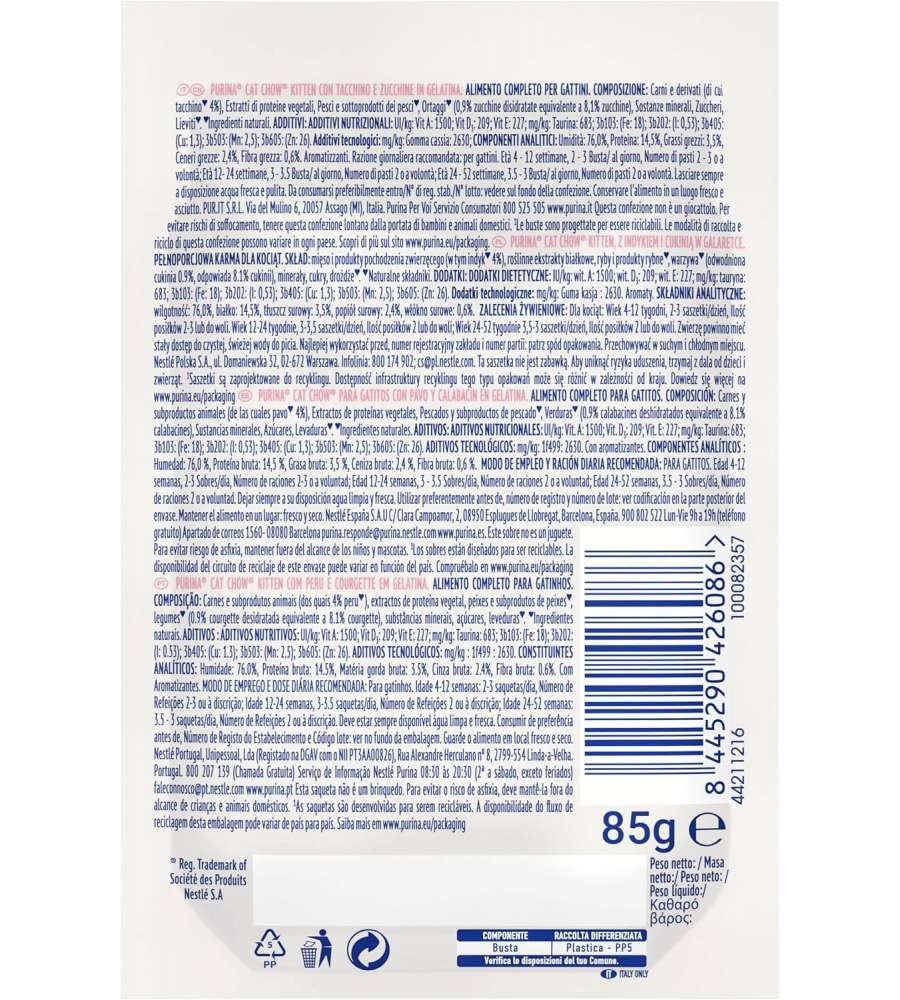 Descrizione: Cibo umido per gattini Purina Cat Chow con tacchino e zucchine. Pezzi teneri in gelatina, senza conservanti o coloranti artificiali. Nutrizione completa e naturale per una crescita sana.