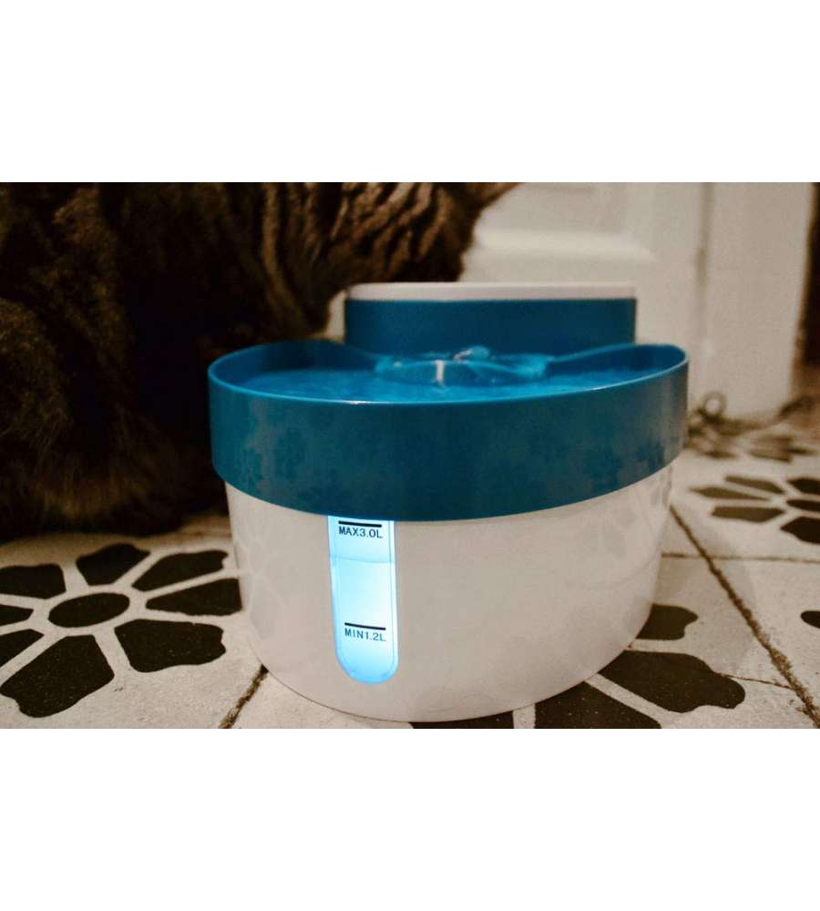 Fontana per animali con ciotola in ABS da 0,8 L, capacità totale 3 L. Filtro a carboni attivi per acqua pulita, pompa con flusso regolabile, alimentazione 12 V. Design ergonomico con finestra trasparente per monitorare il livello dell'acqua.Composizione: